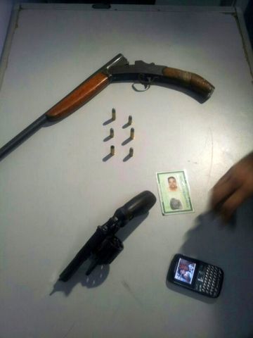 De acordo com o tenente PM Wallace, da Força Tática, ao abordar o veículo Chevrolet Classic LS, placas NOT-7816, preto, que estava parado e levantou suspeita dos militares, foi encontrado em seu interior duas armas de fogo, um revólver calibre 38 e uma espingarda de cano serrado, calibre 32, além de dois celulares.