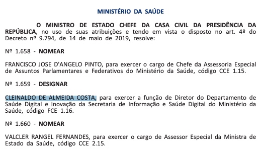 Cleinaldo vai assumir o cargo de diretor do Departamento de Saúde Digital e Inovação, que é ligado à Secretaria de Informação e Saúde Digital do ministério.