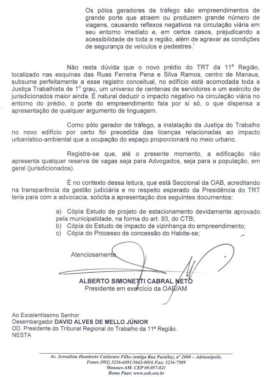 De acordo com Simonetti, o prédio destinado a uma faculdade teria 520 vagas no estacionamento, mas foram reduzidas para 320, com as alterações feitas pelo desembargador David Alves de Melo Júnior, presidente do Tribunal Regional do Trabalho da 11ª Região