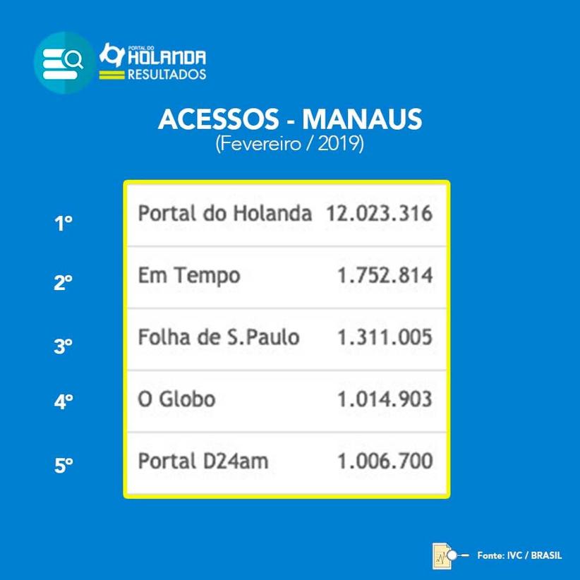 Dos 19,2 milhões de páginas visualizadas em fevereiro por internautas no Portal do Holanda, 12 milhões partiram de dispositivos em Manaus, onde o Portal lidera entre os sites filiados ao IVC