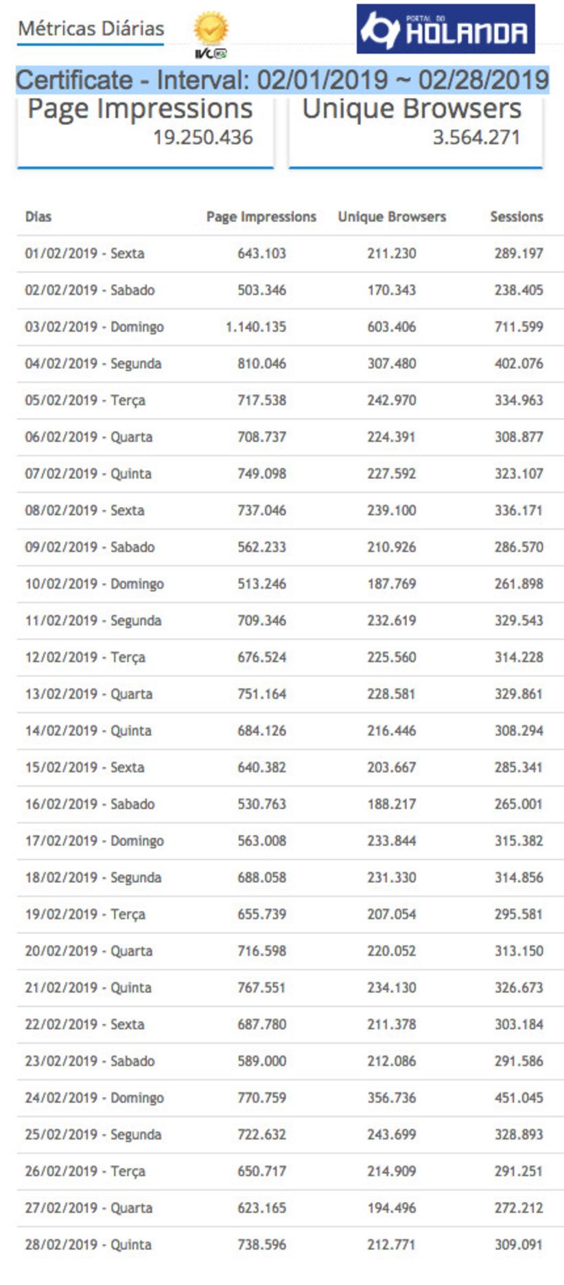 Abaixo, tabela com a audiência Diária do Portal do Holanda, segundo o IVC.