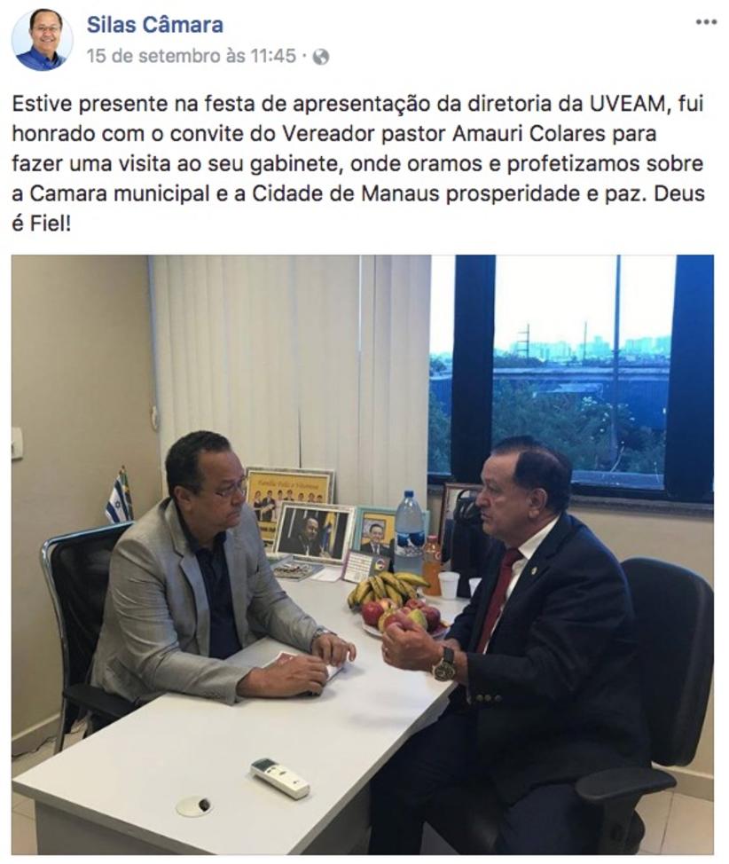 Silas Câmara, além de deputado, é um dos principais ícones da Igreja Assembleia de Deus no Amazonas. E isto está bem claro para o pastor-vereador Amauri Colares, que aproveitou a presença de Silas para levá-lo até seu gabinete. Mas Silas não sentou na cadeira de visitante. Sentou na cadeira do próprio vereador, que tem em sua mesa uma foto de Silas. O registro da visita foi feito pelo próprio Câmara em sua página no Facebook,dizendo que estava lá para orar e profetizar “sobre a Câmara Municipal e a Cidade de Manaus prosperidade e paz”. Ao que tudo indica, Silas é quem faz a oração. Já Colares se dedica ao amém.