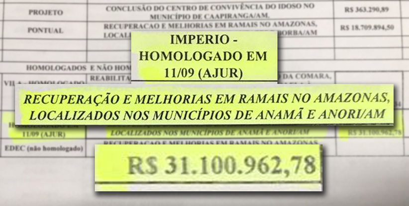 O TCE e o Ministério Público ficam na obrigação de checar se as obras de recuperação  e melhorias de ramais nos municípios de Anamã e Anori”,  contratadas à Império Construções e Serviços Ltda, pelo governo do Estado, foram ou estão sendo realizadas. A empresa, da família da conselheira Yara Lins,  recebeu na última semana R$ 31 milhões pelas obras, mesmo a despeito da decisão do Tribunal de Contas  que  suspendeu   operações financeiro-orçamentárias do governo do Estado, para não comprometer  as ações  do governador eleito que toma posse no próximo mês.