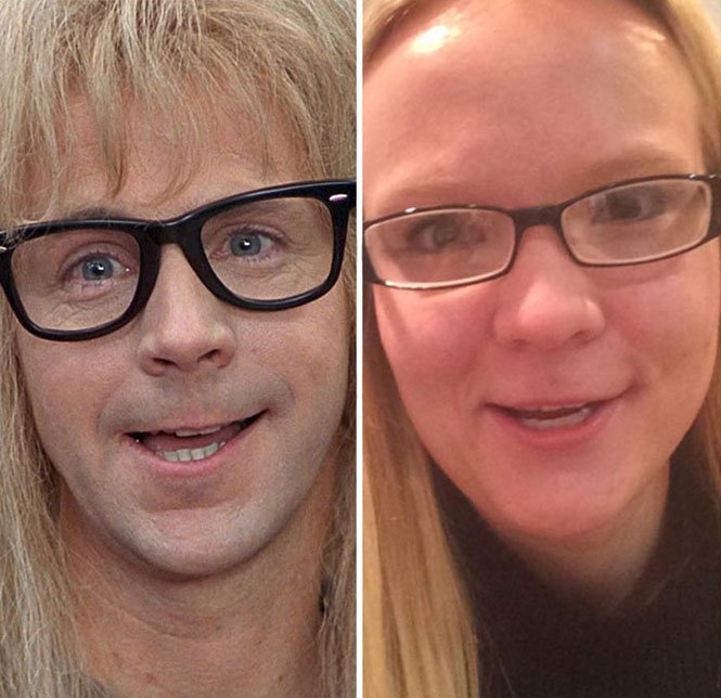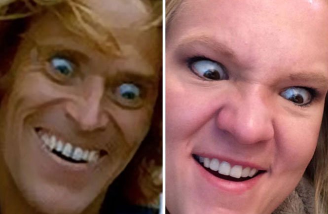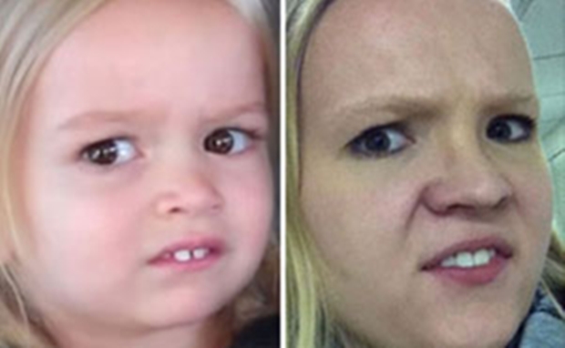 Inspirada nos atores Dana Carvey e Jim Carrey, ela se diverte imitando expressões dos famosos memes da internet.