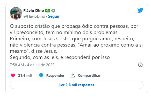 "O suposto cristão que propaga ódio contra pessoas, por vil preconceito, tem no mínimo dois problemas: primeiro, com Jesus Cristo, que pregou amor, respeito, não violência contra pessoas. 'Amar ao próximo como a si mesmo', disse Jesus. Segundo, com as leis, e responderá por isso", escreveu Dino no Twitter.