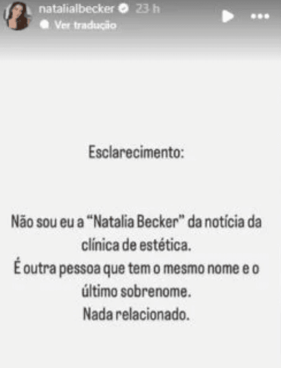 "Esclarecimento: Não sou eu a 'Natalia Becker' da notícia da clínica de estética. É outra pessoa que tem o mesmo nome e último sobrenome. Nada relacionado.", afirmou em suas redes sociais.