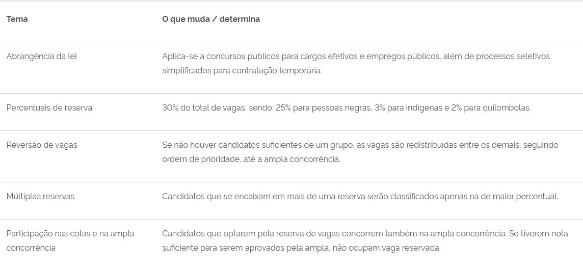 Pela lei, os concursos públicos para órgãos federais deverão reservar 30% do total de vagas para cotas, sendo: 25% para pessoas pretas ou pardas, 3% para indígenas e 2% para quilombolas. A lei vale para todos os órgãos públicos federais, incluindo autarquias, fundações, empresas públicas e sociedades de economia mista controladas pela União.