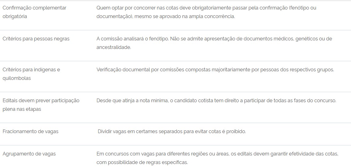 Classificação, nomeação e lista de aprovados - O decreto regulamenta que os candidatos cotistas concorrem também na ampla concorrência, e podem ser aprovados pelas duas listas, desde que tenham nota suficiente. Se forem nomeados dentro das vagas da ampla, não ocupam vaga reservada.