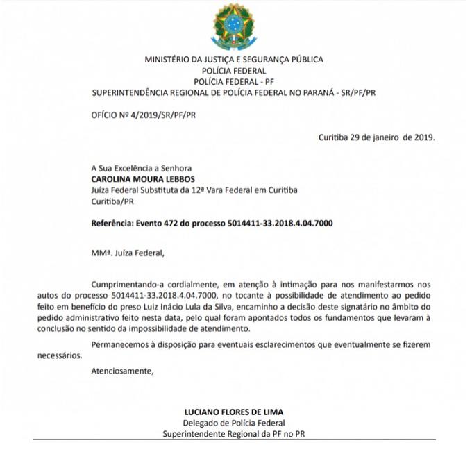 A Polícia Federal ainda considerou que as aeronaves disponíveis para levar o petista estão realocadas para dar apoio às autoridades em Brumadinho.