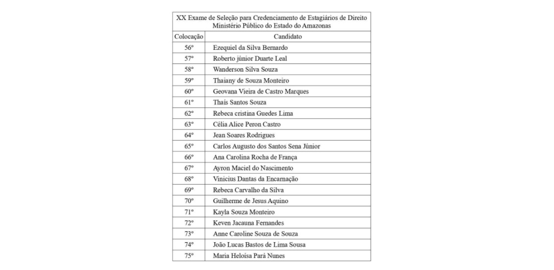 Manaus/AM - Mais 20 candidatos aprovados no XX Exame de Seleção para Credenciamento de Estagiários de Direito do MPAM foram convocados nesta quarta-feira (19).