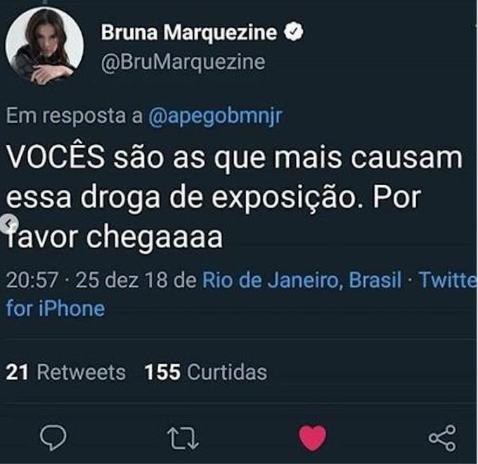 Após a polêmica, fãs do jogador criticaram a atriz pela exposição, mas Bruna não ficou calada e rebateu pelo Twitter: "VOCÊS são as que mais causam essa droga de exposição. Por favor, chega".