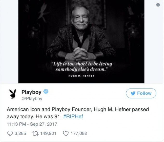 A notícia foi confirmada no perfil oficial da revista no Twiiter. Hugh morreu de causas naturais.