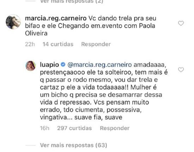 Isso foi o suficiente para gerar comentários e um deles chegou a Luana Piovani. "Você dando trela para o seu bifão e ele chegando em evento com Paolla Oliveira" , escreveu uma seguidora.