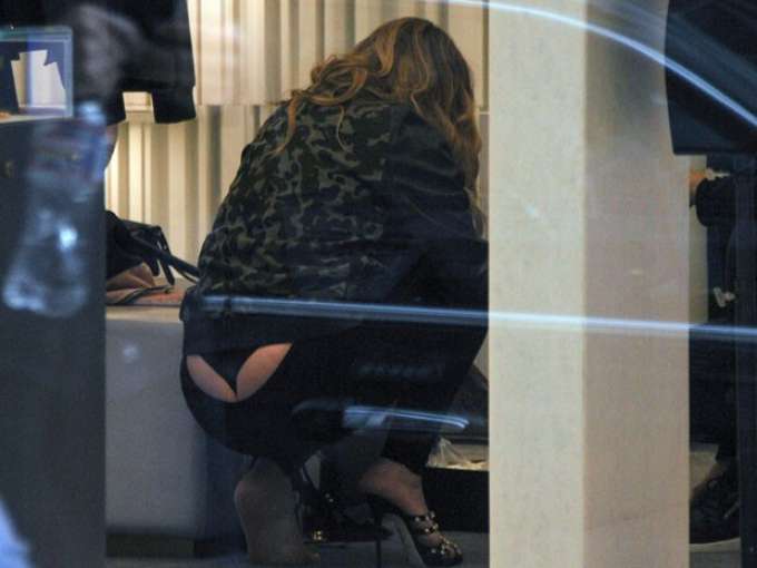 Ao se abaixar para alcançar os modelitos, a calça cedeu e deixou boa parte do bumbum de Mariah de fora. A calcinha fio dental usada pela cantora chamou a atenção e os paparazzos aproveitaram a oportunidade para fazer muitas fotos, antes que ela percebesse a “saia justa”.