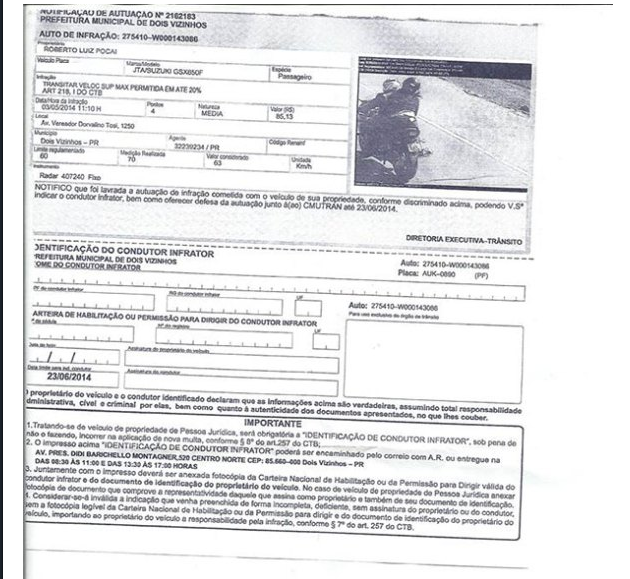 Ao ver a imagem do marido com outra, a mulher deixou um recadinho no facebook para a rival. "Voce jovenzinha que esta na garupa desta moto, solicito sua presença aqui em pato branco, para pagar a multa, vc jovenzinha veja foi filmada, em infração. o condutor ja não jovenzinho que se diz meu marido, estava em adrenalina, por sua companhia… Mas a multa esta aqui, venha aqui se apresentar.. a espero!!!"