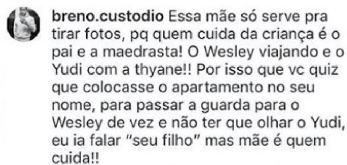 Em resposta ao comentário, Mileide fez um desabafo expondo o cantor, afirmando que ele pratica alienação parental, que está viajando e ainda assim obriga e "faz questão de tirar" o filho de perto dela, o "compra" com presentes e viagens a Disney, e além de afirmar que foi enganada pelo ex e que o apartamento em que mora é dela , disse ainda que Wesley e Thyane estão "fazendo a cabeça" de Yhudi contra a mãe e o deixando o menino desestruturado e nervoso. Confira: