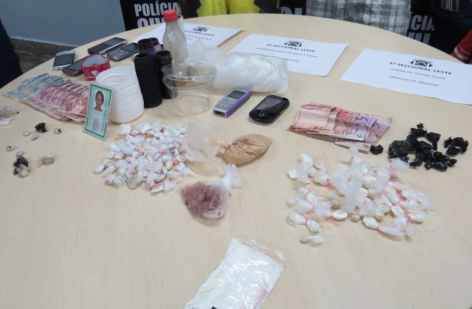 Durante diligência pela rua 3 do bairro São José 3, os policiais prenderam em flagrante Luana de Souza Silva. Em uma quitinete localizada na rua 3, bairro São José 4, um adolescente de 16 anos foi apreendido. Com eles foram encontradas 10 trouxinhas de substância entorpecente, entre cocaína e maconha, cinco celulares e R$ 64 em espécie.