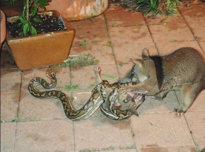 De acordo com a australiana Christine Birch Williams, que testemunhou a cena no jardim de sua casa em Queensland, o filhote de gambá estava sendo estrangulado pela píton, quando a mãe passou a morder a serpente até que soltasse seu bebê.